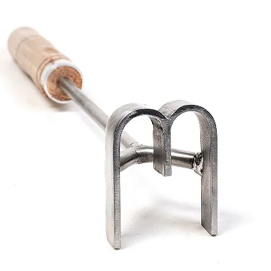 Marcador de gado produzido em Inox 304 na letra (M), cabo com acabamento e suporte para dedão de madeira tratada.