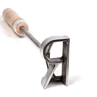 Marcador de gado produzido em Inox 304 na letra (R), cabo com acabamento e suporte para dedão de madeira tratada.